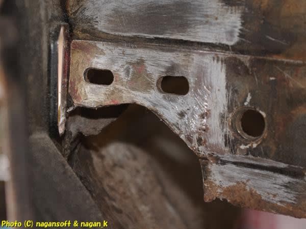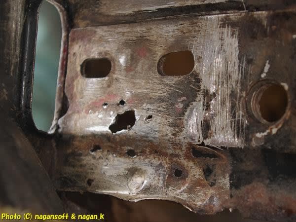 バンパーブラケット固定のところは、めっちゃ薄い鉄が残ってますが、小さい錆穴いっぱいではっきりいって錆クズですよ。