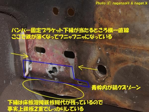 バンパー固定ブラケット下縁が当たる横一直線上に鉄板が薄くなってフニャフニャになっています。