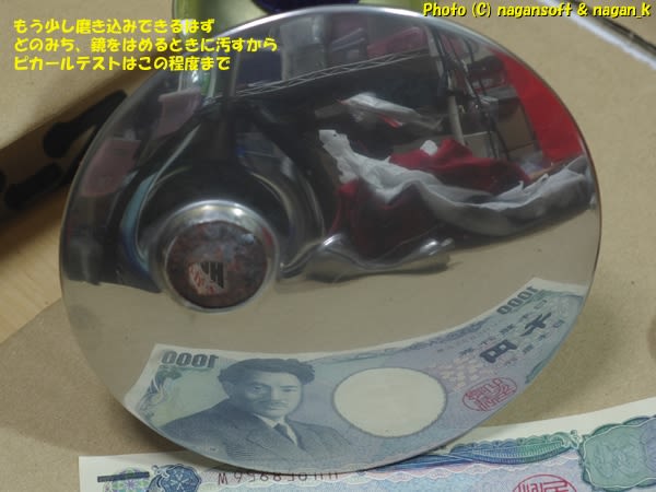 しかし、私はこのバックミラーに鏡をはめる作業とか、まだまだ加工しなければならないので、今のタイミングで磨き完成度を追及しても無駄なのよ。(はめこみ作業で、また汚すから…)
