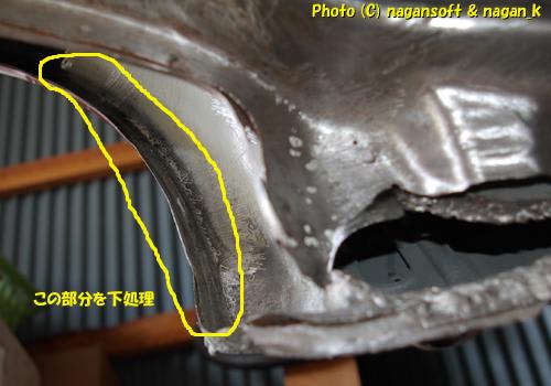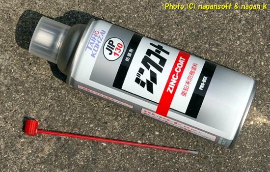 だいぶん、サビ穴がふさがってきたので、そろそろやり時かなーと、袋になる部分にジンクスプレーを入れることにする。