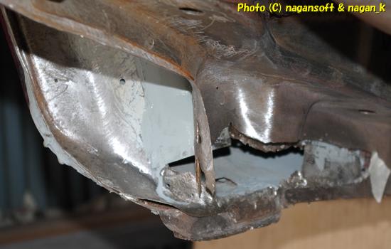 そして、ジャッキポイントの内側をサビ取り専念していないことに気付いた。今なら横面がサビ穴なので作業しやすいぞーってことで、ジャッキポイント内部をなるだけ錆び取りしてやった。