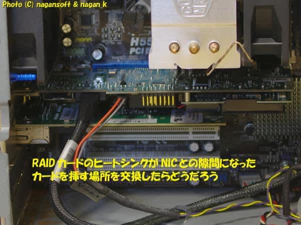 RAIDカードの下にNICカードが来る位置関係にて、RAIDチップの冷却ヒートシンクがカードの隙間に位置することになります。