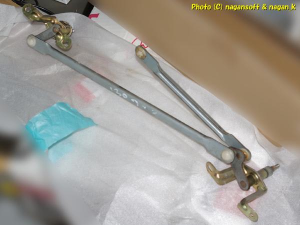 そして、ワイパーリンクを取り外して、「こりゃーシャフト部分交換必須やで、ここの部品がでたら8000円ぐらいやと思うけど、古いからなーワイパーリンクASSYでないと出ないと思うは、それやと4万ぐらいするでー。」との説明。