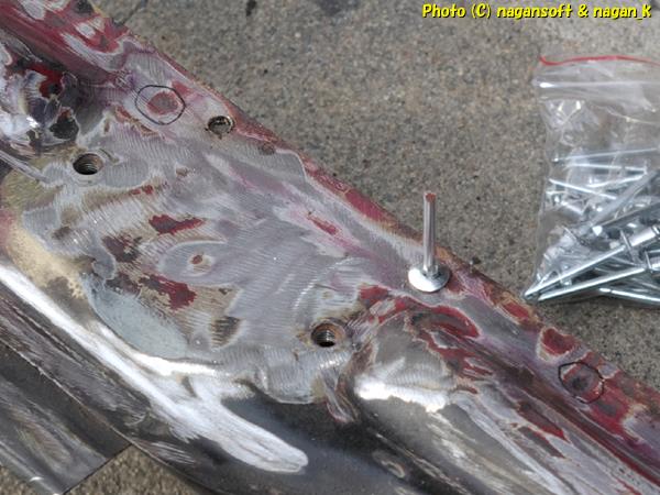 鉄板が腐っているのでサクサクと穴開けできた箇所があります。多分その部分は錆び鉄板でダメなところなんでしょうけど、バランスを考えると、そこにリベットを打ちたいのです。