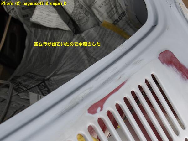リヤガラスはめ合い部の車体外装部分に下地に塗ったサビ止め塗料エポローバルの筆ムラが薄く出ていました。