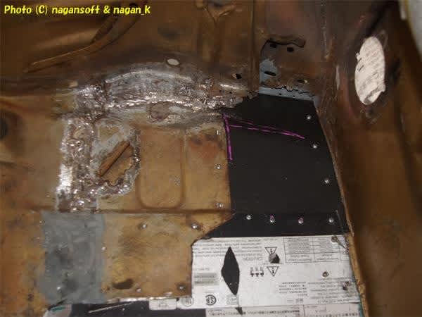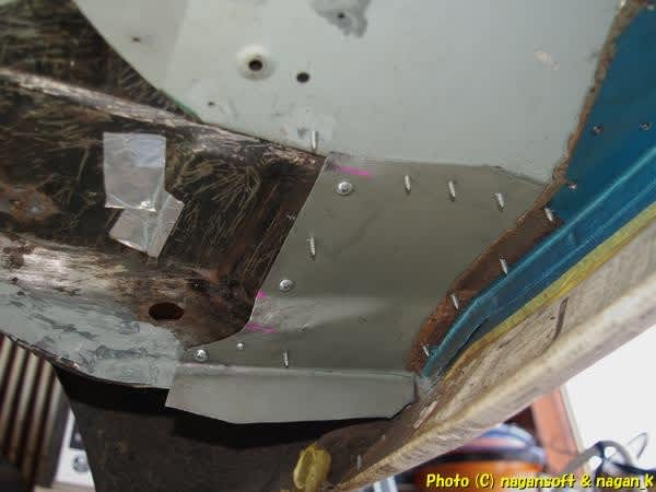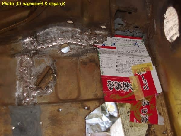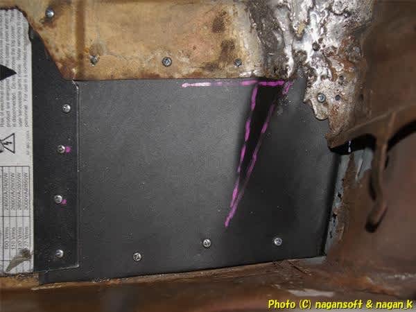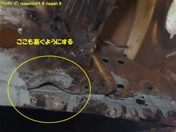 床裏から見えている錆穴ばっくり箇所も同じ鉄板を延長作成にて一緒に封印しようと企みます。