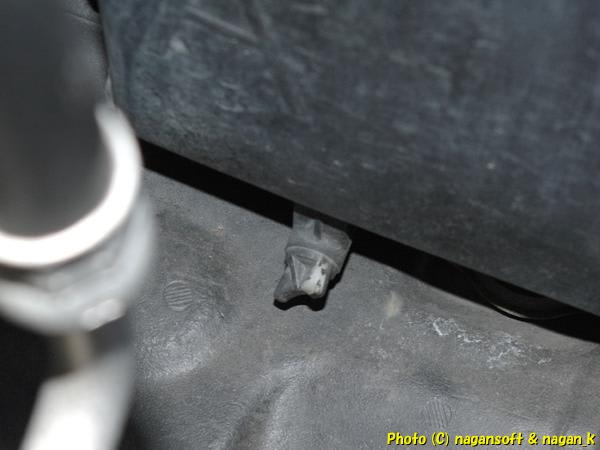 写真撮影してから、抜け飛んだドレンつまみを捜索しました。エンジンアンダーカバの上に転がっているのを発見して回収です。