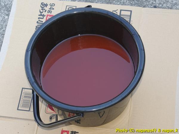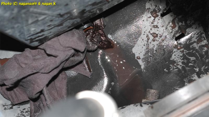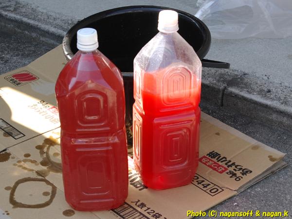 尚、舟は汚れているので、そこに溜まったクーラント液は廃棄にします。といってもクーラント液って下水へ流すことができませんから、ペットボトルへ回収して次回に自動車整備工場へ行くときに処分をお願いすることになります。