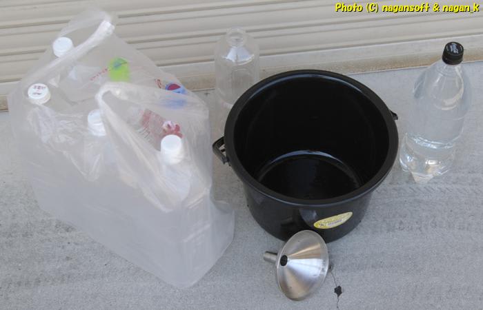空きペットボトル数本、7リッターのバケツ、ロート、手洗い用の水をペットボトルで1本です。