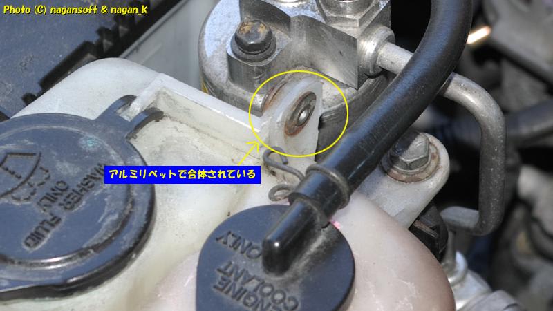 と、リザーブタンクを取り外そうとしたら、なんと隣のウオッシャータンクとリベットで加締め結合されていました。