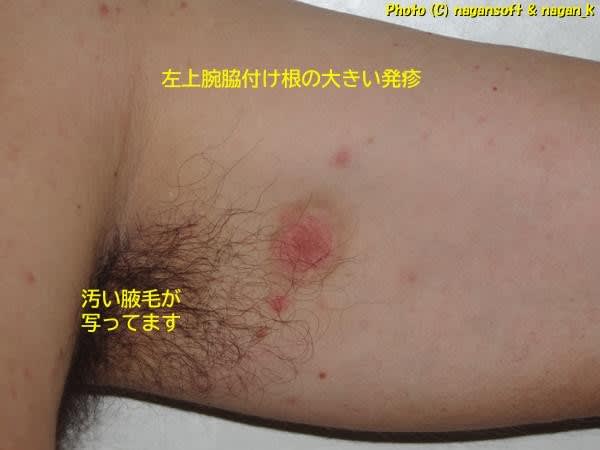 まずは、左上腕脇の下に突然できた大きい発疹の確認。
