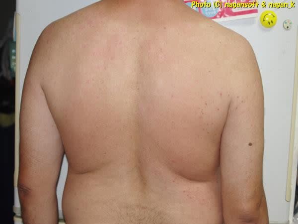 体幹右半分にマラセチア毛包炎多く分布。というか類乾癬が右半分に多かったからね。その治療で軟膏を塗っていたところに広がっているという。