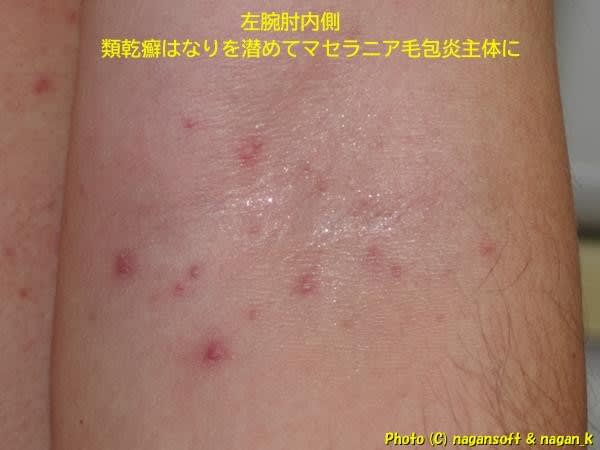 右腕脇周辺の小さい点はマラセチア毛包炎です。