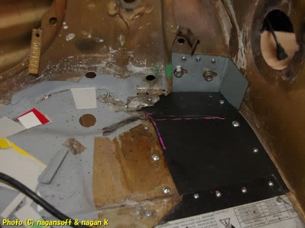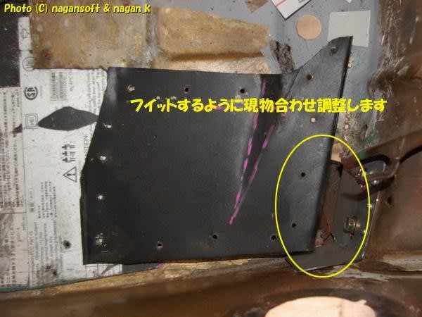 左フロントバンパー固定ボルト通し穴補強板と、トランク床板とのクリアランス調整していきます。