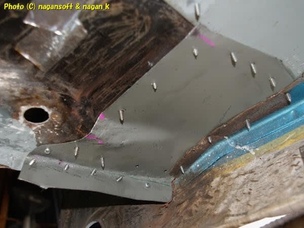 叩いたピースを仮付けして叩いて微調整。仮付けで対応できないような大き目修正は外してハンマーで叩いてというのを4回ぐらいしました。取り外してのハンマー板金はガレージ外でするのでもちろんすぶ濡れになります。なにしてんだか。
