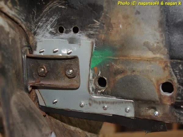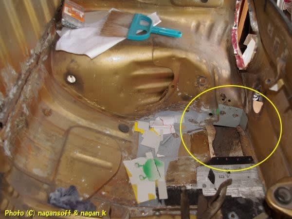 ここで車体下に潜ってトンテンカンとハンマー打ちするのですが、私の下半身は車体の外ですね。それも足首から先はガレージの外に飛び出てます。