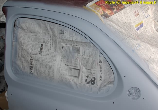 左クオーターガラスはめ合い部のサビ取りは終わりましてプラサフを吹きました。