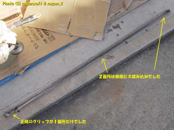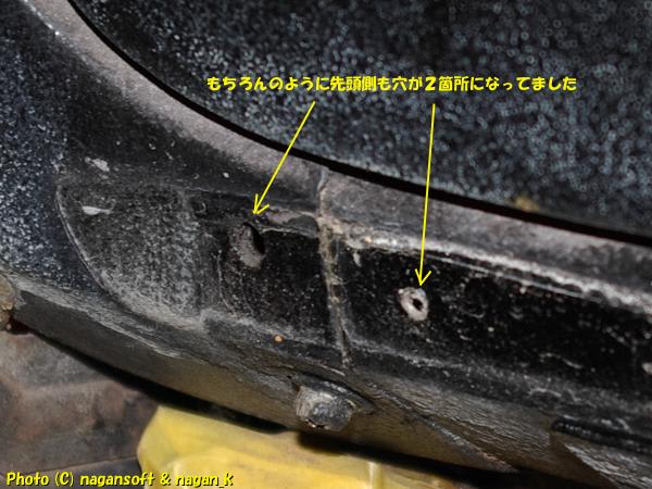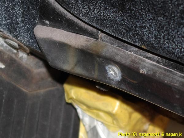 R-2君のサイドステップモールは、ピアノ線をS字に曲げたようなクリップで固定されているのですが、私のR-2君は、左側サイドステップモールを鉄板ビスで揉み込まれてます。