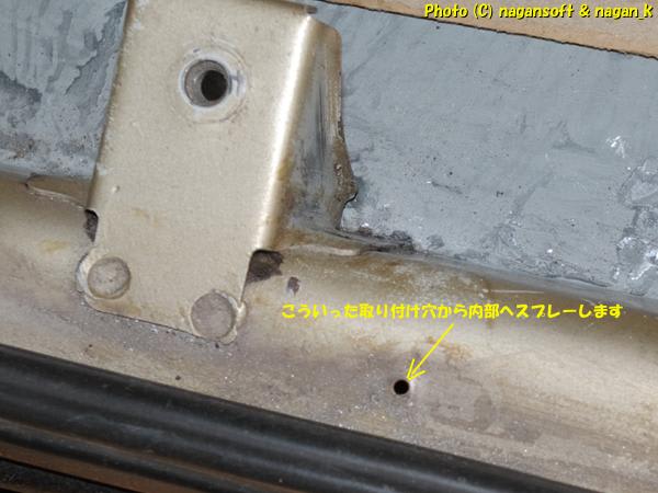 サイドシルのサビ穴処置をして塞いだのにどうやって内部を処置するのかというと、そこはお手軽な作戦で、ネジ穴や、モール固定穴といったところから内部を狙い撃ちするだけです。