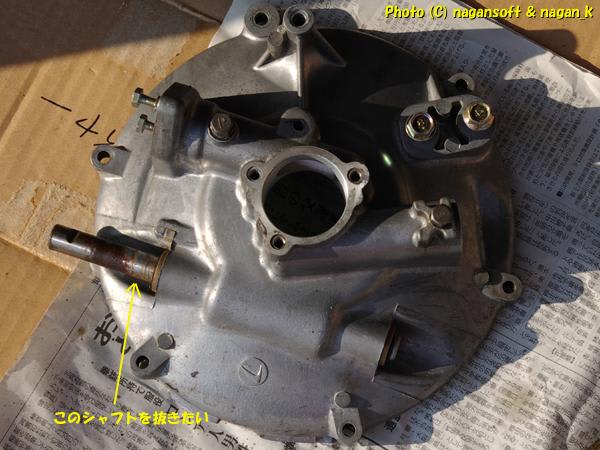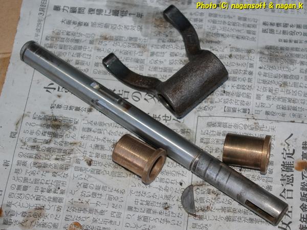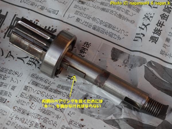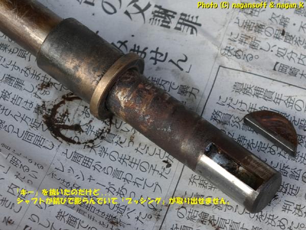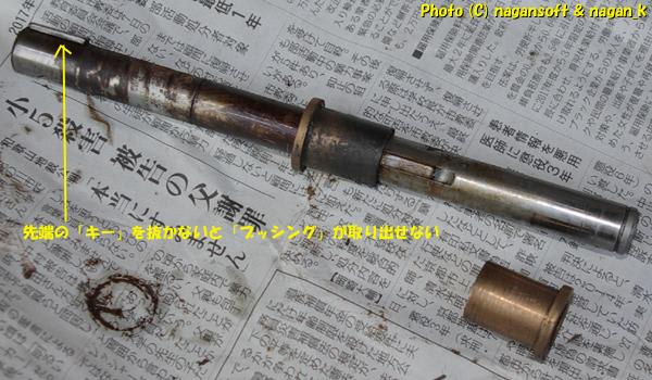 下側へ抜き取ろうとしたら、上側のブッシングがシャフト先端のキーに引っかかってしまい、結果としてシャフトが取れません。