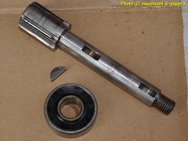 しかし、シャフトへ上側のブッシングが通ったままなのです。ということで先端の「キー」を取り外しますよ。