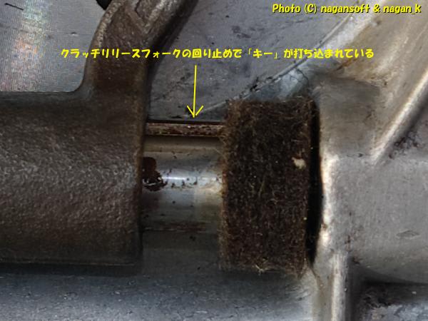 リリースベアリングフォークがシャスととの回り止めとしてキーが打ち込まれているではないか。