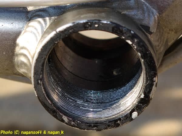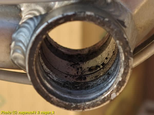 BBを抜き取った自転車フレームの穴は汚れてます。