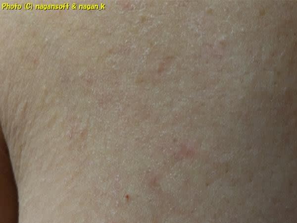 写真中央にポツンとある新しい紅斑は「マラセチア毛包炎」と思われるものです。その他のモヤーンとアザになりかけているような紅斑が類乾癬で、薬が効いて消えていこうとしているものです。