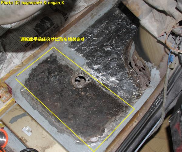 今日から運転席手前床のサビ取り開始です。
