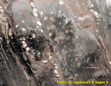 虫食いみたいに見えますが、白色で丸く見える部分がハンダが入っている部分です。黒色がシャーシブラックまたはチップコートで、赤茶色がサビということです。