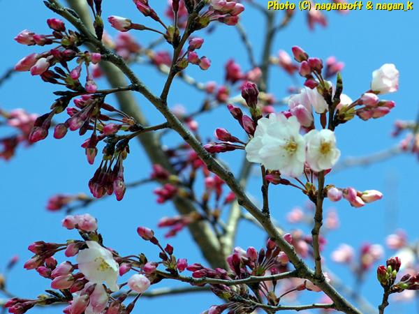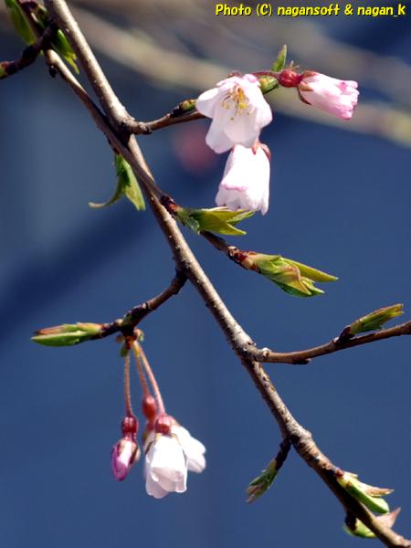 紅白の桜もですが、もっと面白いのは、同じ木なのに、葉っぱの新芽が出ている枝もあります。