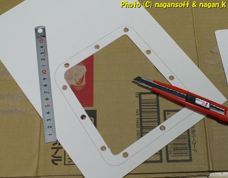 こういうのは、小さい部分から切るのが鉄則だと思うので、まずはボルト穴をカッターで切ります。