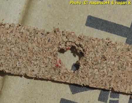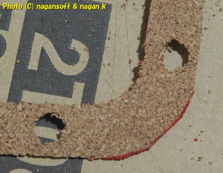 私のような不器用がカッターで切ったらこの程度の円にしかできません。カッターで上の層を丸く切っても、下の層では丸く切れないという感じで、モロモロと崩れるのですから。