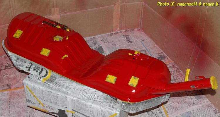 前回に半分だけ塗装した燃料タンクです。艶々でいいやねー。と思いながら….