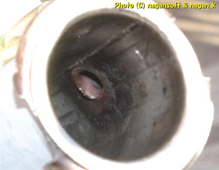 私がタンクの外側をサビ止め塗ったのでわかりにくいなーと言いながらも、タンク内部にミラーを突っ込んで確認してもらった中で、「ココとココをサビ穴塞ぎ溶接してある。このパイプ根本はろう付け足しているな。大分ダメージのあったタンクを修理しているんやなー。」と指摘された。