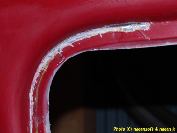 左クォーターガラスはめ合い部の、下側ガラス固定部分に錆がちょびっとありました。