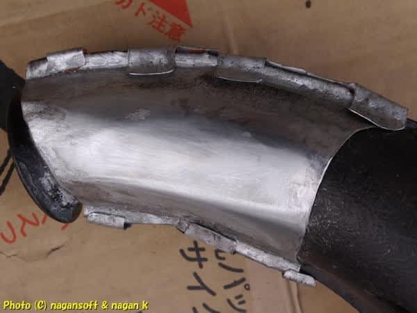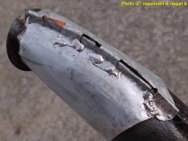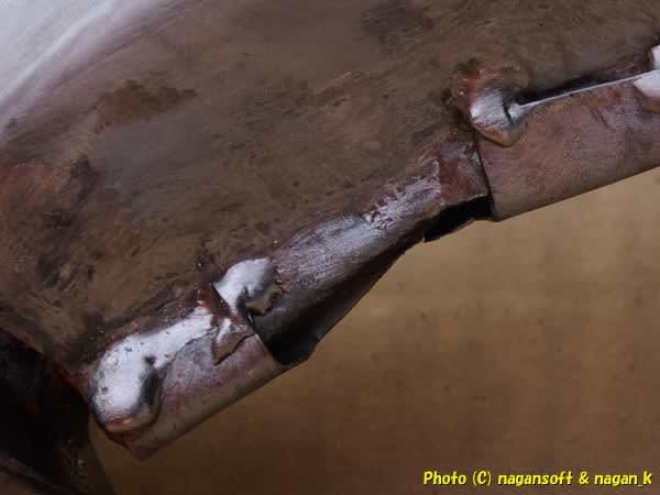 裏側はメッキ肌ですが、板金のハンマーが当っているので、ところどころの鉄地肌露出しています。