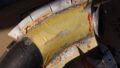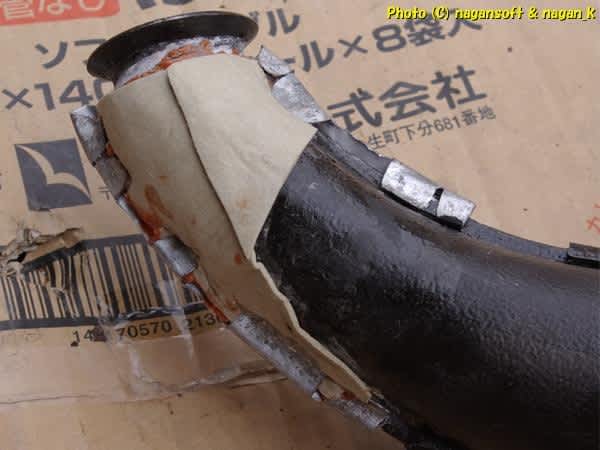 現状のマフラーパテは剥がさずにその上から、液体ガスケットをヘラで隙間にしっかり押し込んでシートを貼り付けます。そして自作カバーを被して糊代を折り込みます。
