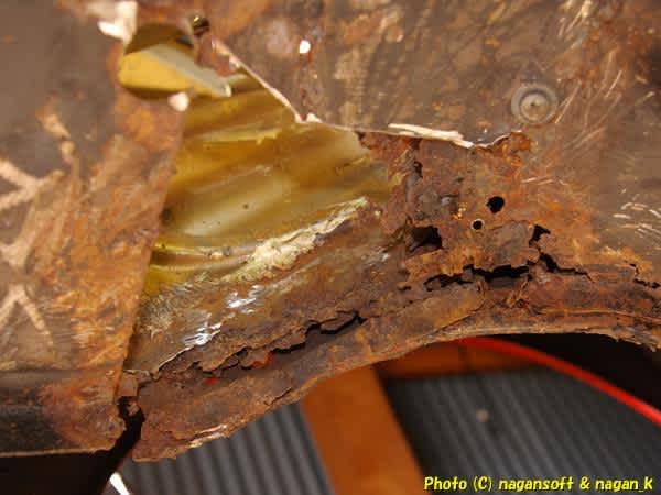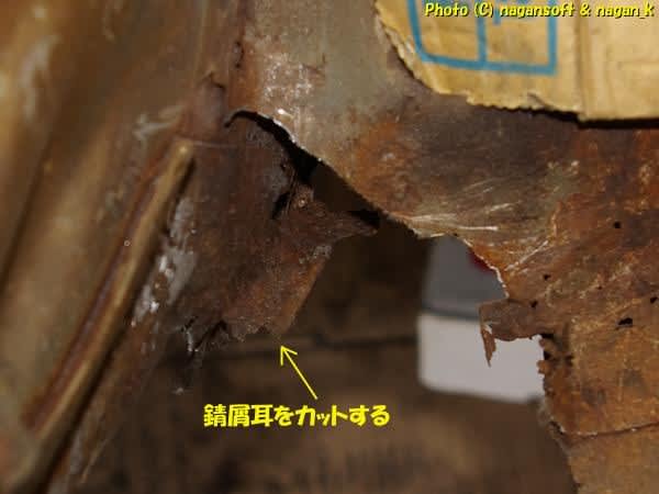 切り取ったら浮き錆がごとっと落ちた。フェンダー下端が溶ろけて無くなってます。