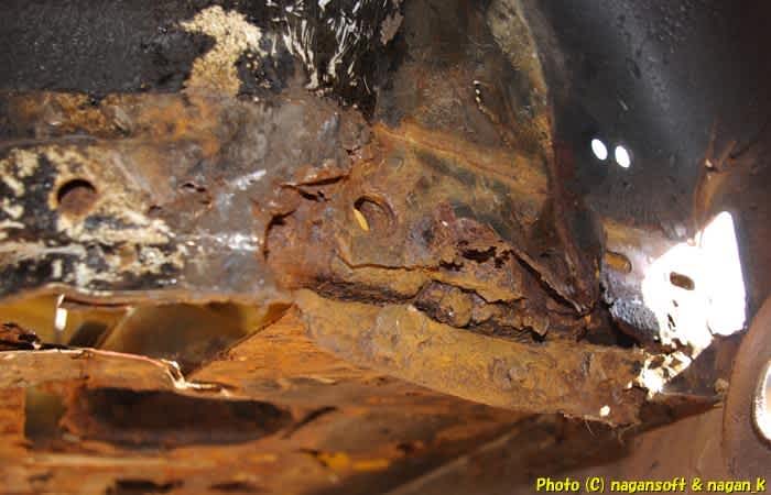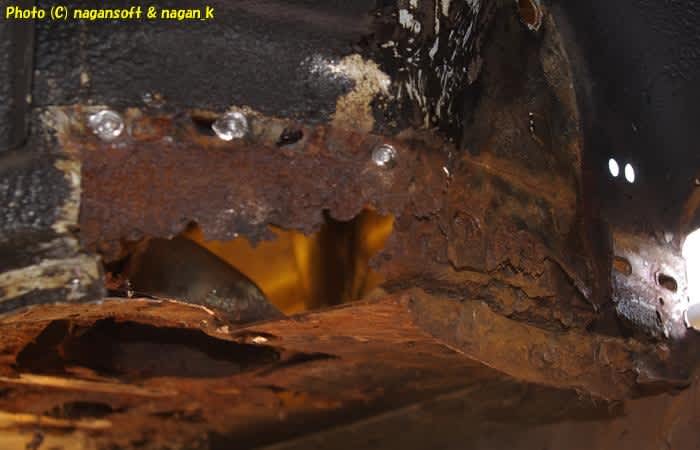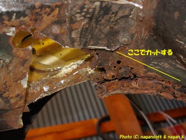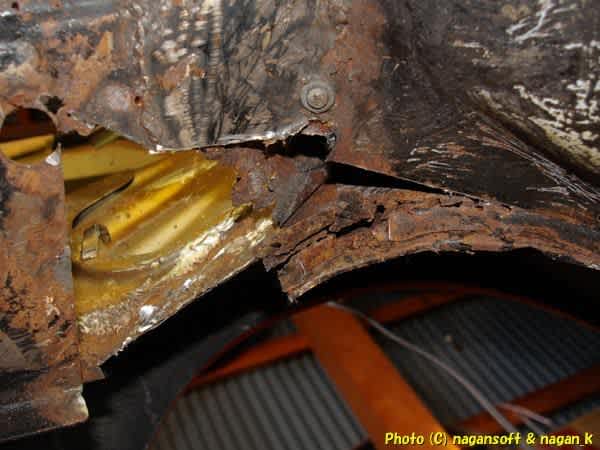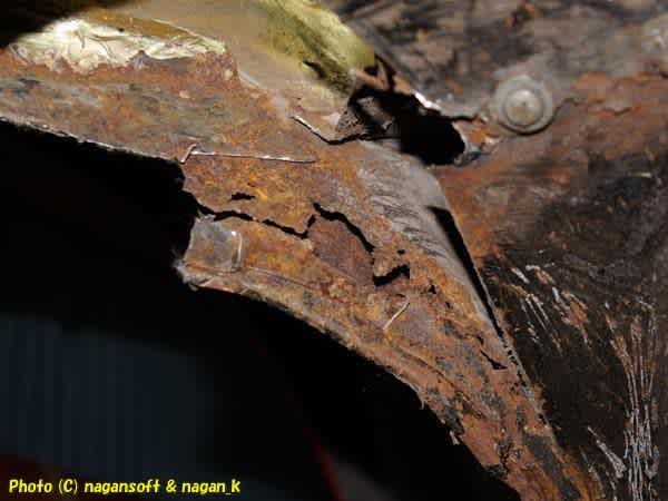 フェンダー内側の帯鉄が思いのほかしっかりしているのですが、その反対側は錆で鉄板がなくなっているのよね。つまり、内側の鉄板が下端無いってことなんです。