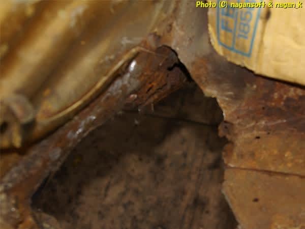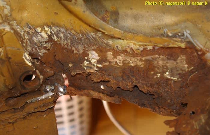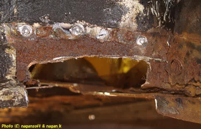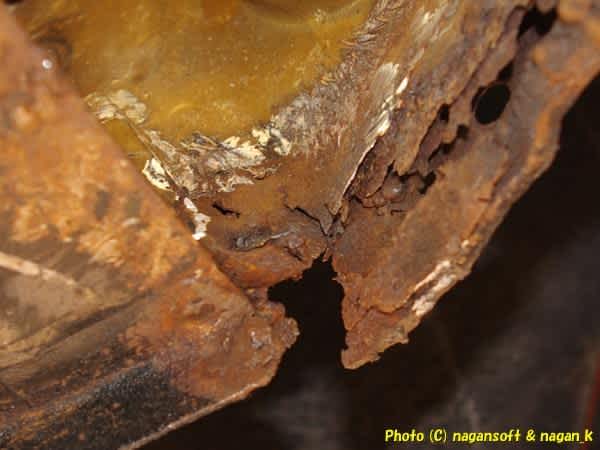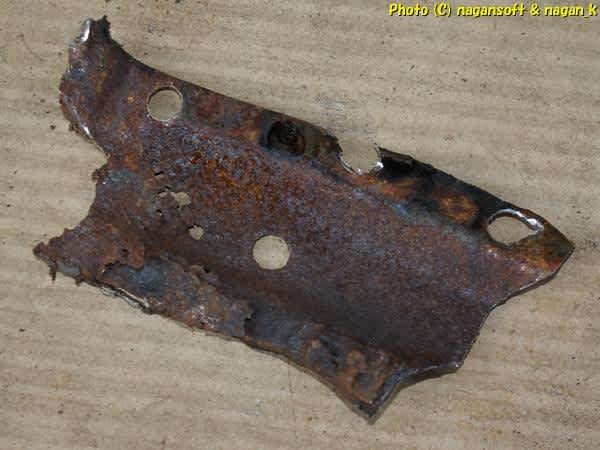 その鉄板をはがしたところで溶接足掛りにしていた物が錆屑として残っているんです。