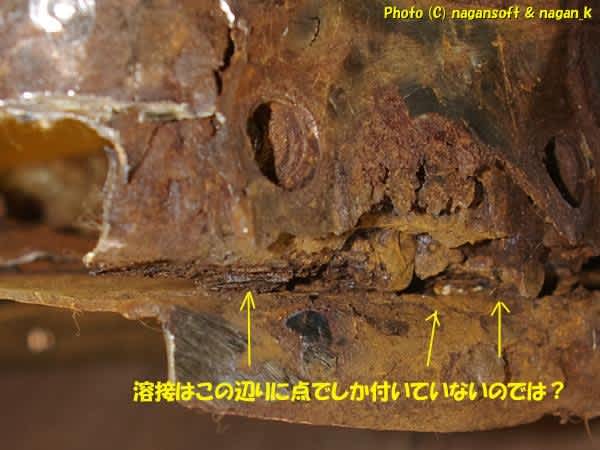 でも相手が錆屑床だったので、溶けて穴が開いたり、溶接団子になったりと苦戦した形跡を感じます。そして付いている箇所は点で3箇所ぐらい。