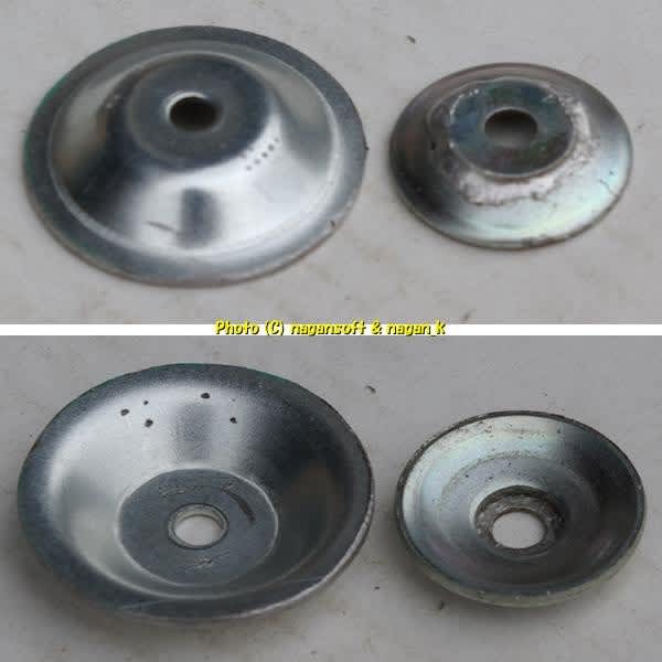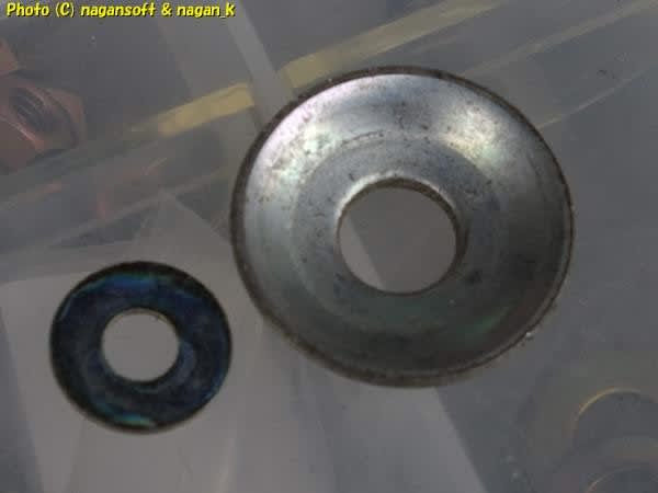 直径25.0mmの皿座金です。ボルト通し穴が大きいので5mm用の平ワッシャーをくっつけます。