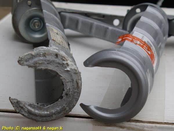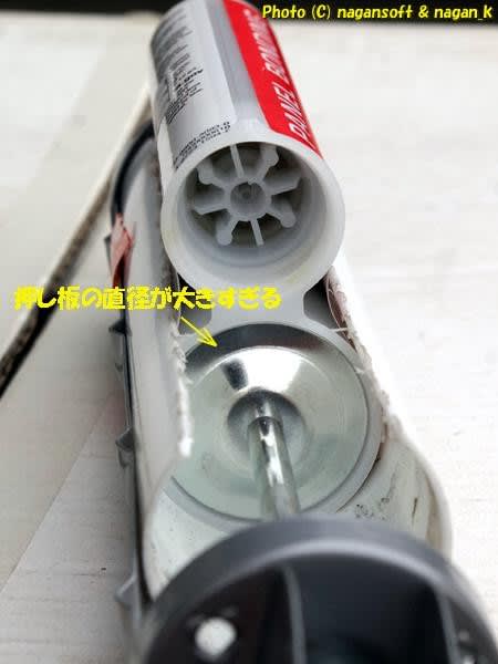 実際のところは、ホームセンター特売ガンも、20年愛用ガンも、押し板が大きくてパネルボンドの筒内部に入りません。