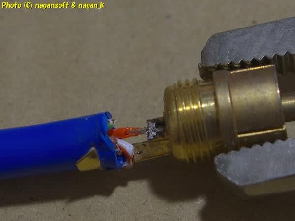 今度は芯線4本ずつをまとめてハンダ結線です。(ケーブル向いたりハンダしたりしている途中写真撮影忘れている)