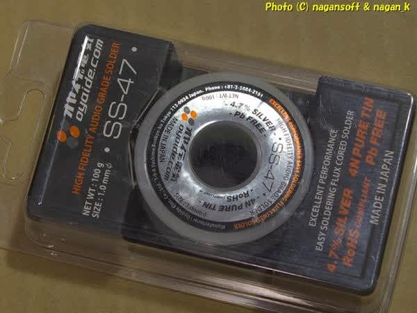間違えて私の手元に転がってきた、オーディオ向けのオヤイデさんのハンダを用います。(自動車ハンダ板金修理用ハンダとしてまとめてゲットしたジャンクハンダに混じっていたのよ)