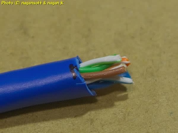 ちなみに、Cat5のSTPケーブルです。100BaseTのシールド無しイーサケーブルということです。8本の芯線は単線です。