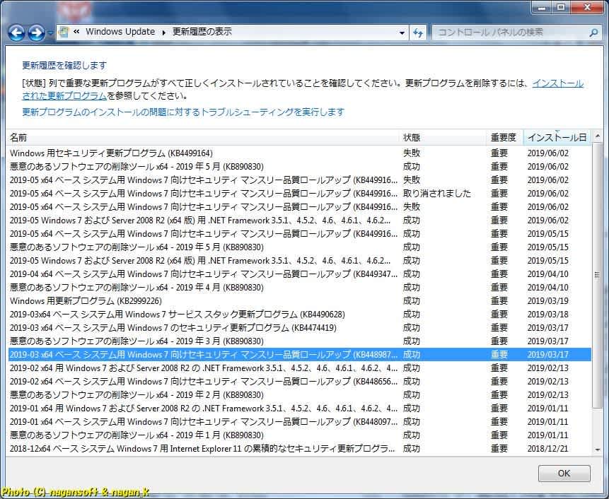 WindowsUpdate の「更新履歴を確認します」より、「インストールされた更新プログラム」を参照 確認するも、KB4489878 がインストールされていない。 それって何よ? ネットでググると… 2019 年 3 月 13 日 – KB4489878 (マンスリー ロールアップ) https://support.microsoft.com/ja-jp/help/4489878/windows-7-update-kb4489878