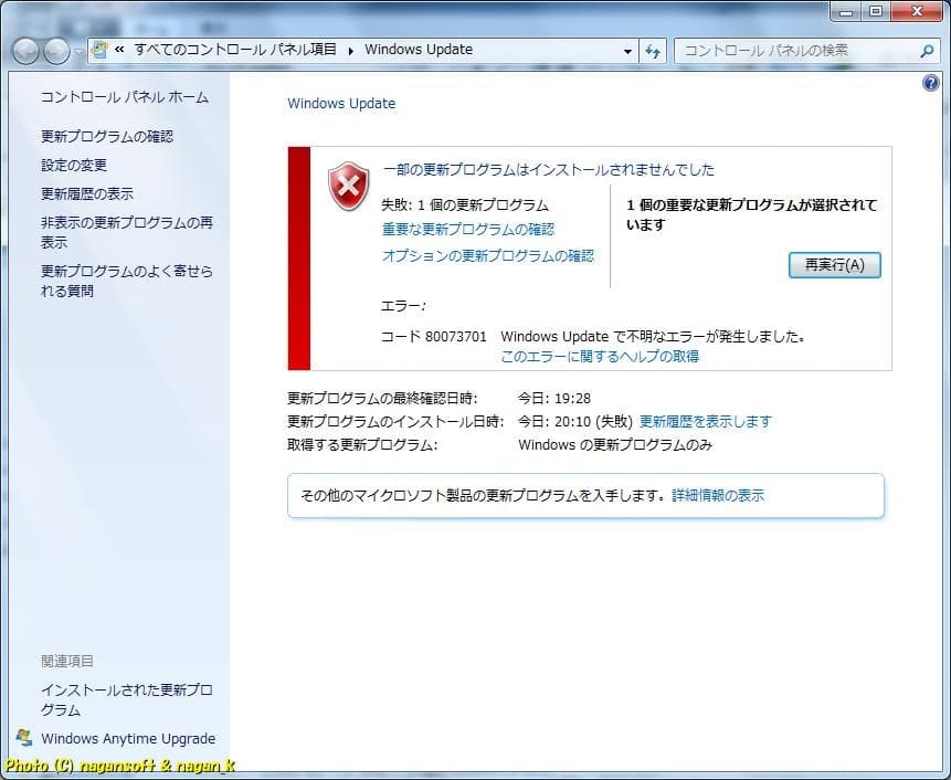 さあー、気になるWindowsのシステム更新です。 まずは普通にWindowsUpdateを実行。 特に問題なく更新完了。 続けて、もう1回WindowsUpdateを実行。 すると、無限再起動地獄に落ちた。更新中XX%が表示されてしばらくしてブルースクリーンのパターン。 F8押下セーフモードで起動したら、WindowsUpdateに失敗しました。復元します。といった画面でロールバックされた。