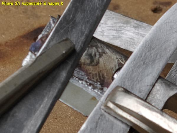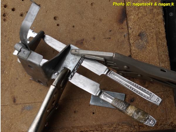 昨日に付き合わせした部分が熱でずれたらいやなので、プライヤーの面積だけではなく、もっと広い面積で押さえつけるように、激貧が所有している当て金のナイフを差し込んでます。